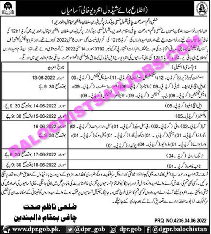 Health Department Chaghi Prince Fahad Bin Sultan Welfare Hospital has scheduled test interview for their vacant post which was published in newspaper. Those candidates who applied for these vacant jobs are informed that their test/interviews will be conducted on the following schedule below.