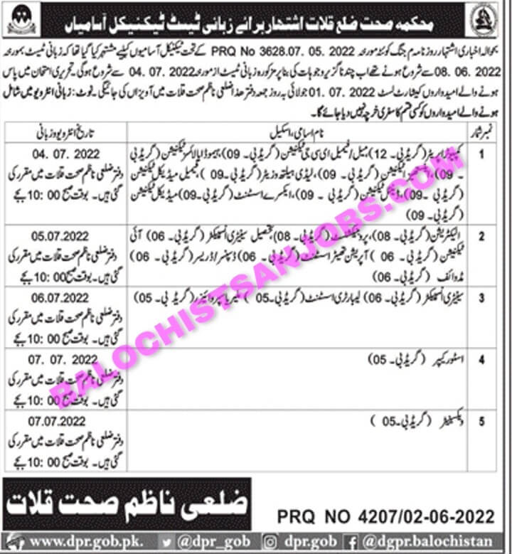 Health Department Kalat has scheduled Viva test interview for their vacant post which was published in newspaper. Those candidates who applied for these vacant jobs are informed that their test/interviews will be conducted on the following schedule below.