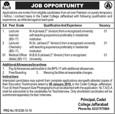 Application are invited from eligible candidates from all over Pakistan on purely temporary / adhoc / contract basis /in the cadet college jaffarabad with following qualification and experience, as reflected against each post.