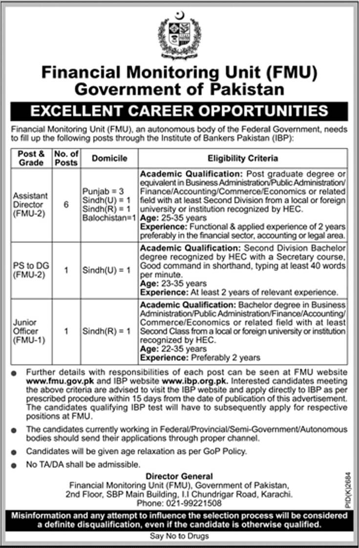 Financial Monitoring Unit (FMU), an autonomous body of the Federal Government. needs to fill up the following posts through the Institute of Bankers Pakistan (IBP):
