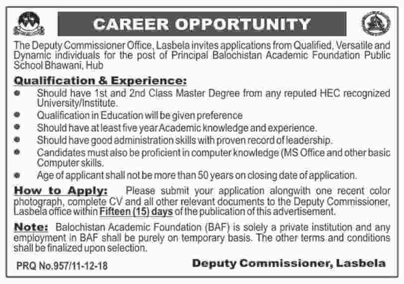 The Deputy Commissioner Office, Lasbela invites applications from Qualified, Versatile and Dynamic individuals for the post of Principal Balochistan Academic Foundation Public School Bhawani, Hub