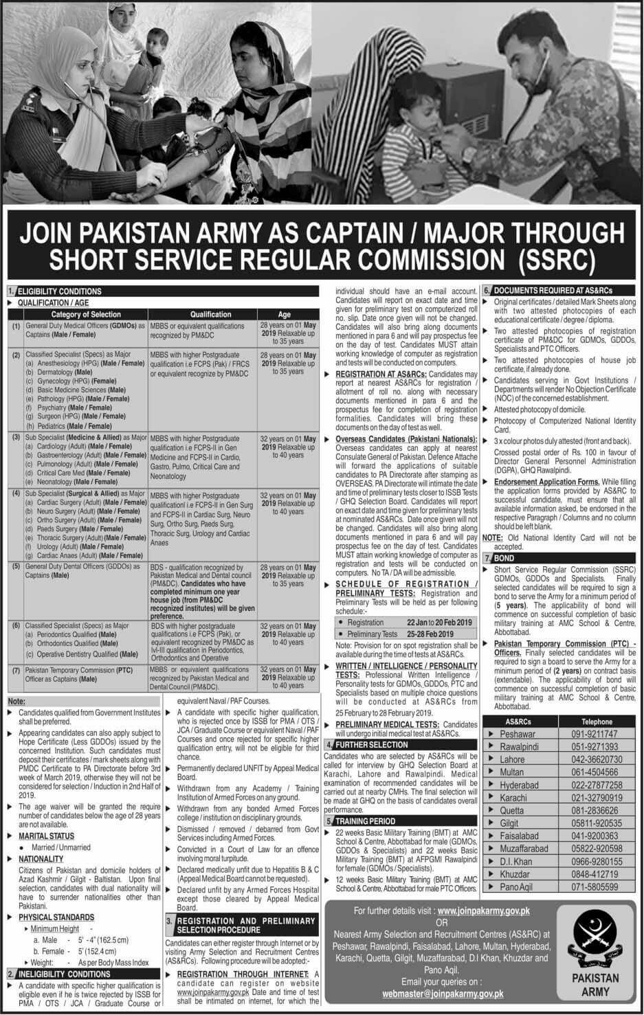 For further details visit www.Joinpakermy.gov.pk OR Nearest Army Selection and Recruitment Centres (AS&RC) at Peshawar, Rawalpindi, Faisalabad, Lahore, Multan, Hyderabad, Karachi. Quetta. Gilgit. Muzaffarabad, DI Khan, Khuzdar and Pano Aqil.