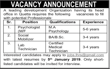 A leading development organization having its head office in quetta require the following vacancies to fill with potential professionals.